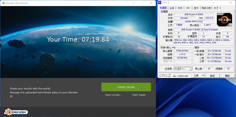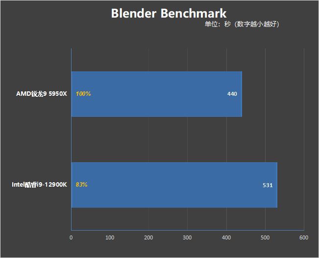 在blender benchmark的cpu测试结果中,5950x的成绩是7分20秒,换算秒数为440秒。