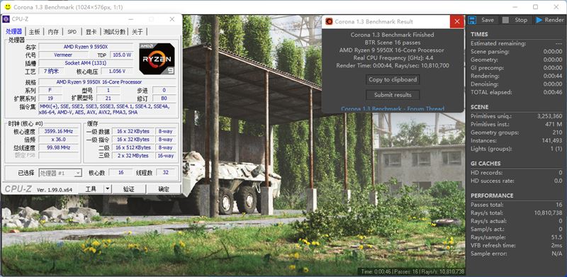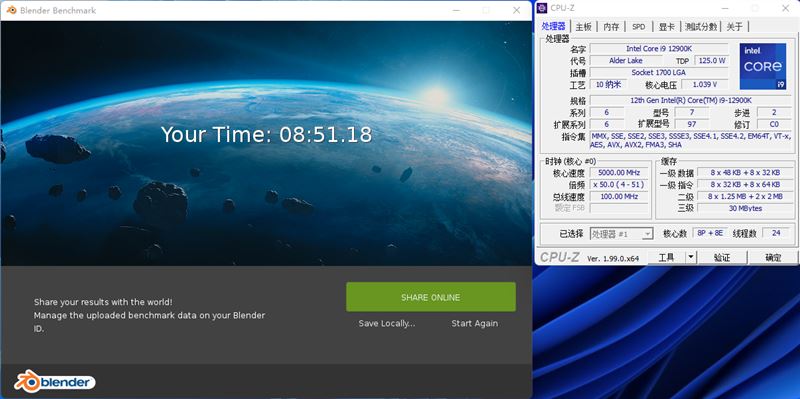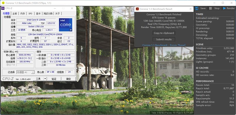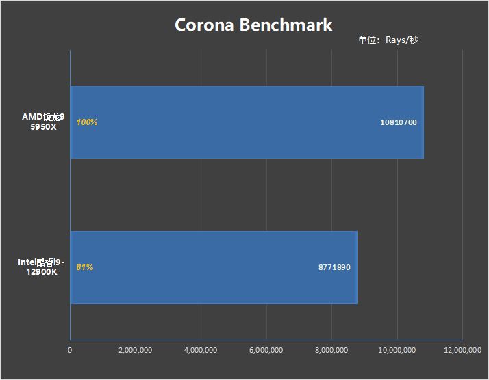 在corona benchmark测试中,5950x得到了10810700 rays/秒的成绩,i9-12900k为8771890 rays/秒。