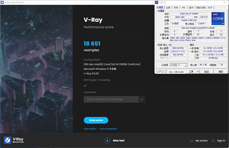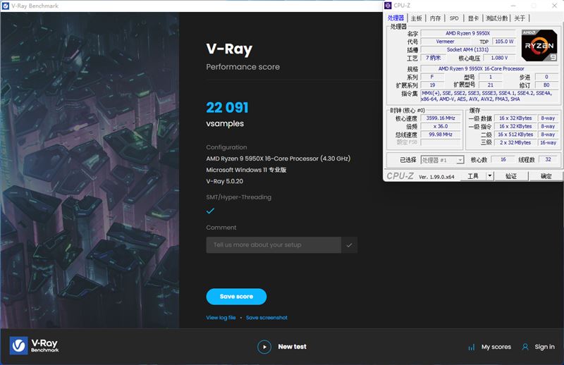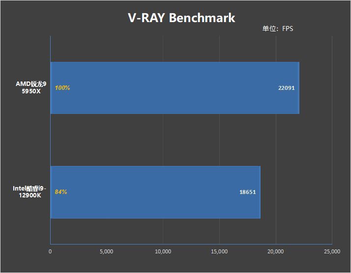 在v-ray benchmark测试结果中,5950x的成绩为21673,i9-12900k为18651。