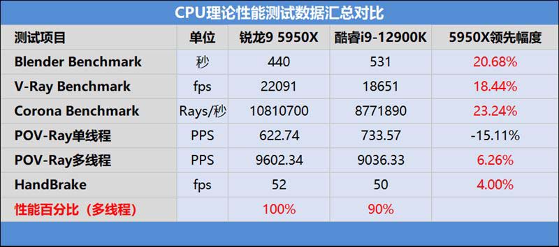 可以看出,在渲染图形这方面,依然还是amd锐龙9 5950x更有优势,比i9-12900k最多领先了23.24%的高幅度,这点也并不意外。