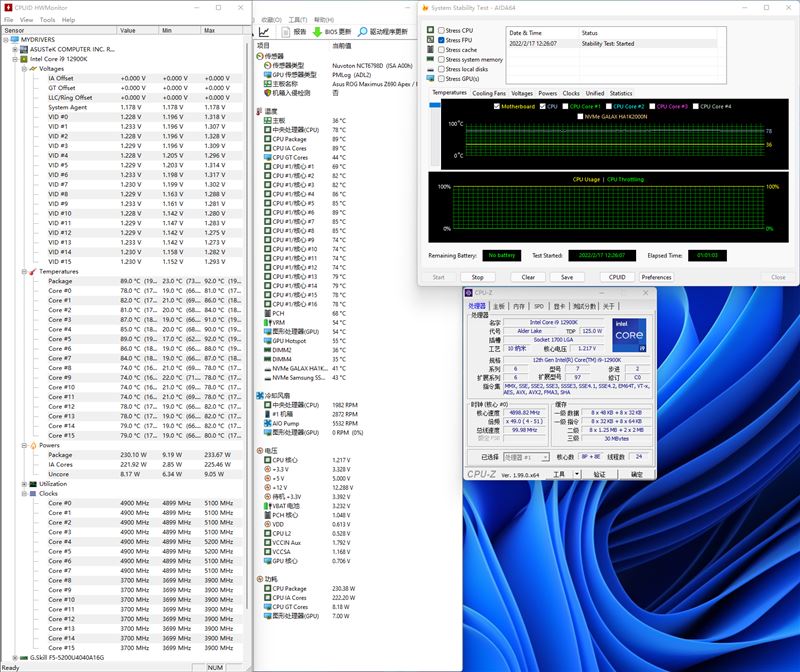 intel酷睿i9-12900k在一小时的烤机项目中,全程功耗约为230w,全核频率为4.9ghz,处理器温度最高为89度。