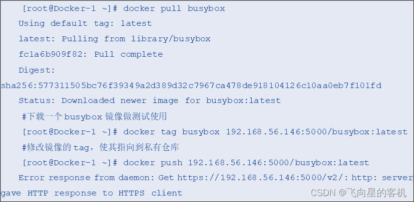 以上示例拉取了一个 busybox 镜像,并为其添加了 tag 标识,在尝试将镜像推送至私有仓库时,发生了报错。