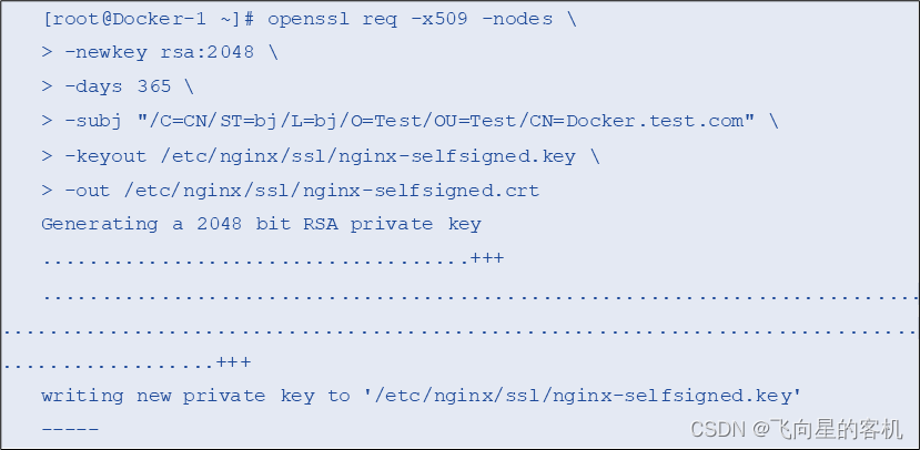 (2)然后通过 openssl 工具生成私钥和证书,示例代码如下: