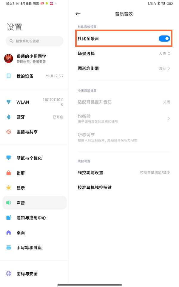 或者也可以从屏幕顶部下拉状态栏,点亮【杜比全景声】。
