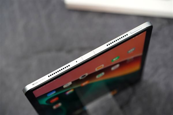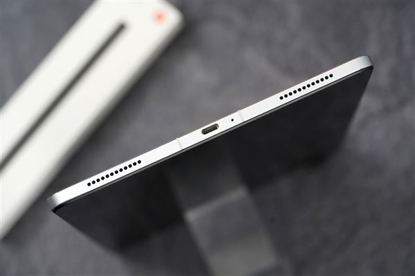 平板底侧边框仍有两个扬声器,与顶部扬声器组成四扬声器环绕系统,而且支持杜比环绕音。type-c接口位于底侧边框中央,右边则是一个降噪孔。