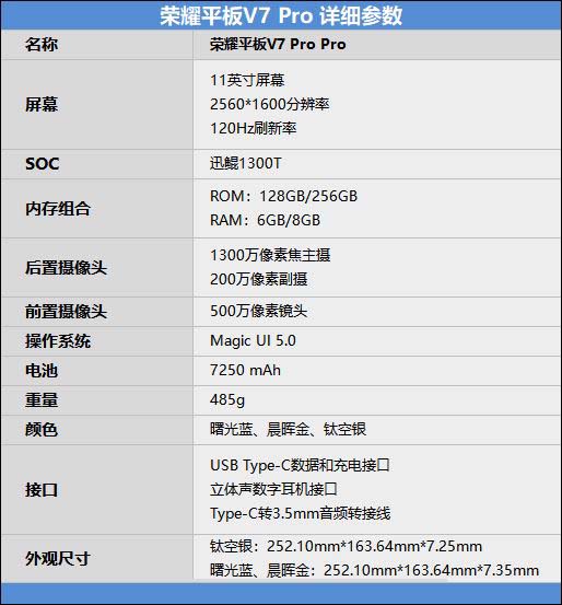 相较于其他单纯堆料的产品来说,荣耀平板v7 pro更加注重硬件设计给用户日常体验带来的感受。2560*1600的分辨率外加120hz刷新率,能够大幅度提升日常使用的流畅性。联发科迅鲲1300t 6nm工艺处理器的加入,让超长时间续航成为可能,可以说是强性能与长续航的完美平衡。