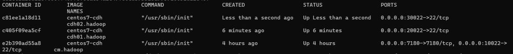 docker run -d \ --add-host cm.hadoop:172.10.0.2 \ --add-host cdh02.hadoop:172.10.0.4 \ --net hadoop_net \ --ip 172.10.0.4 \ -h cdh02.hadoop \ -p 30022:22 \ --restart always \ --name cdh02.hadoop \ --privileged \ centos7-cdh \ /usr/sbin/init \ && docker ps