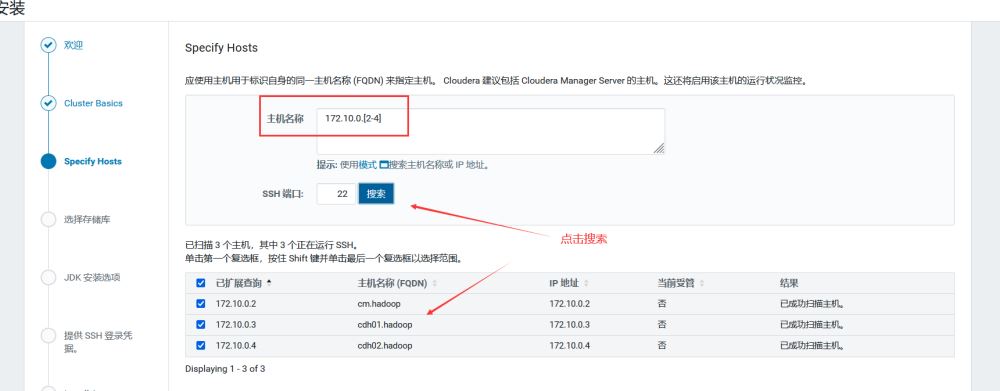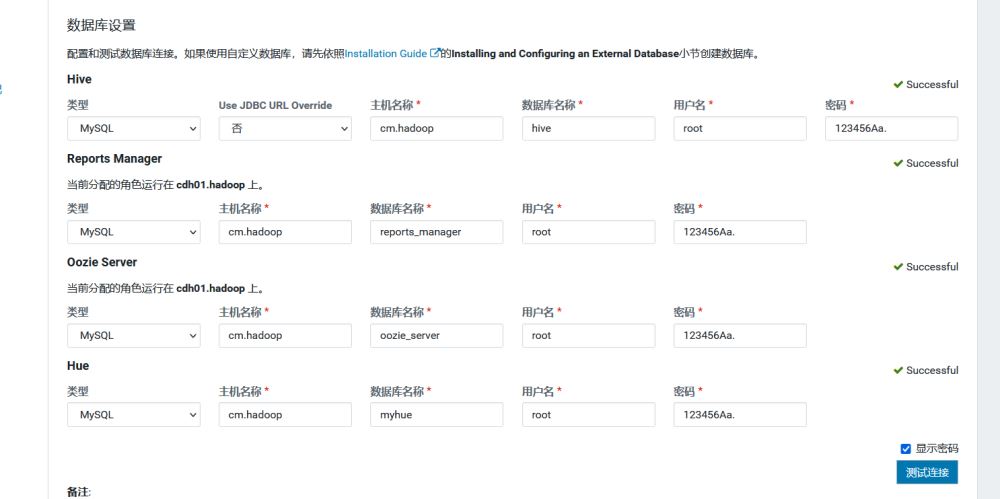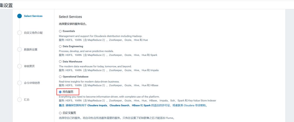 这里如果选择了hive之类的组件,需要在cm结点上创建一个数据库,可以用组件名命名