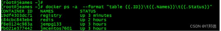 docker ps -a --format "table {{.id}}\t{{.names}}\t{{.status}}"