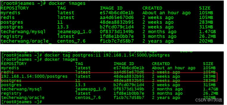 [root@jeames ~]# docker images [root@jeames ~]# docker tag postgres:11 192.168.1.54:5000/postgres