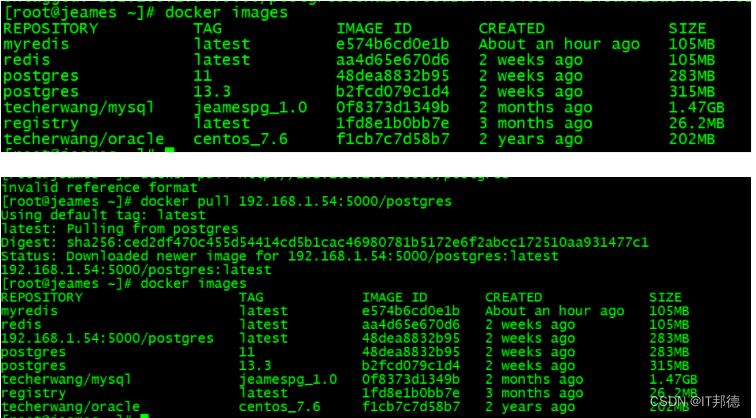 [root@jeames ~]# docker rmi 192.168.1.54:5000/postgres [root@jeames ~]# docker images [root@jeames ~]# docker pull 192.168.1.54:5000/postgres