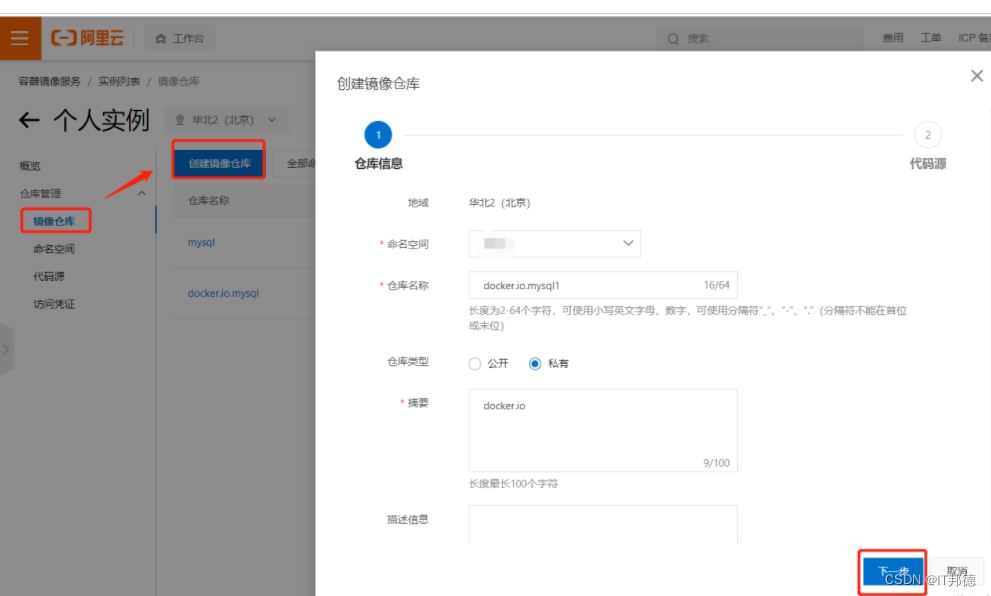 访问阿里云容器镜像服务地址 https://cr.console.aliyun.com/cn-beijing/instances
