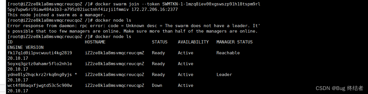 以上就是【bug 终结者】对 【云原生】阿里云服务器部署 docker swarm集群 的简单介绍,部署 docker 集群,在微服务架构不超过10个的情况下会采用docker swarm或compose 部署项目,如果超过的话,需要去适用k8s 来部署我们的项目上线! 后续会更新 k8s 相关文章,docker 已完结!