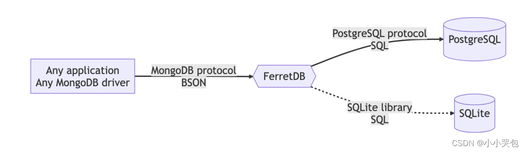 说到替换 mongodb,不得不提一下 ferretdb[4],ferretdb 的目标是允许使用现有的关系型数据库来处理 mongodb 的查询请求,它充当一个代理,接收来自应用程序的 mongodb 查询,并将其转换为相应的 sql 查询,然后将结果返回给应用程序。ferretdb 支持使用 postgresql 或 sqlite 等关系型数据库作为后端存储引擎,其架构如下: