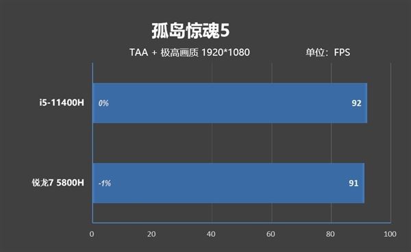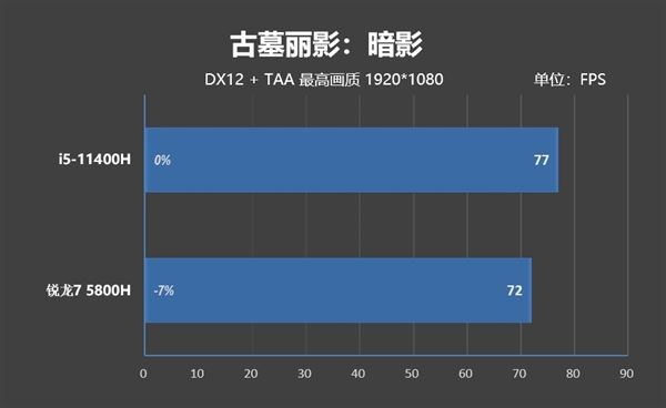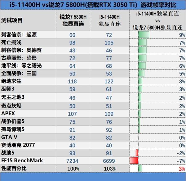 综合来说,在3a大作中,搭配rtx 3050 ti级别的独显时,i5-11400h的游戏性能要比锐龙7 5800h强3%左右,最多可以领先达到10%,幅度达到和超过5%的就有7款。