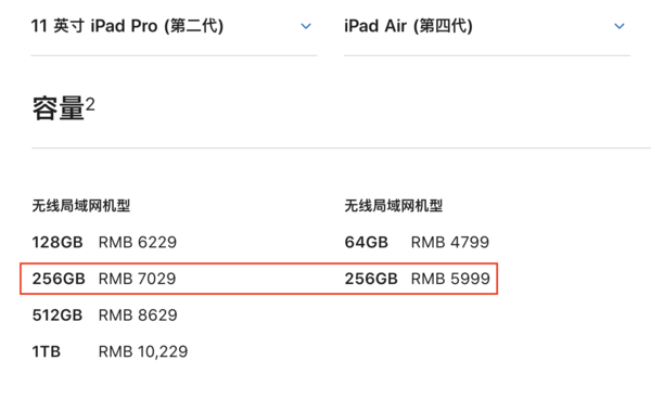 同存储容量的ipad air与2020款ipad pro 11英寸差价为1030元
