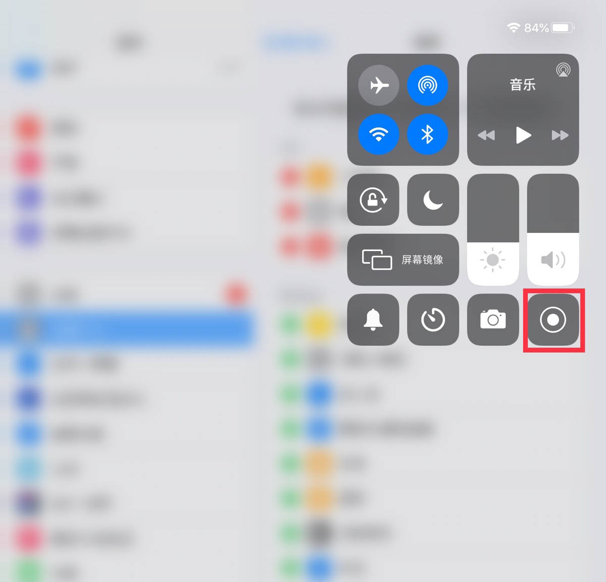 4、手指从ipad屏幕上方,慢慢下滑打开快捷中心,长按右下角的屏幕录制快捷方式(同心圆图标)