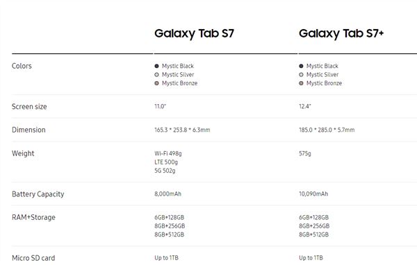 网络方面,galaxy tab s7有lte、5g两个版本,重量分别是500、502克,而galaxy tab s7+是575克,5g版。