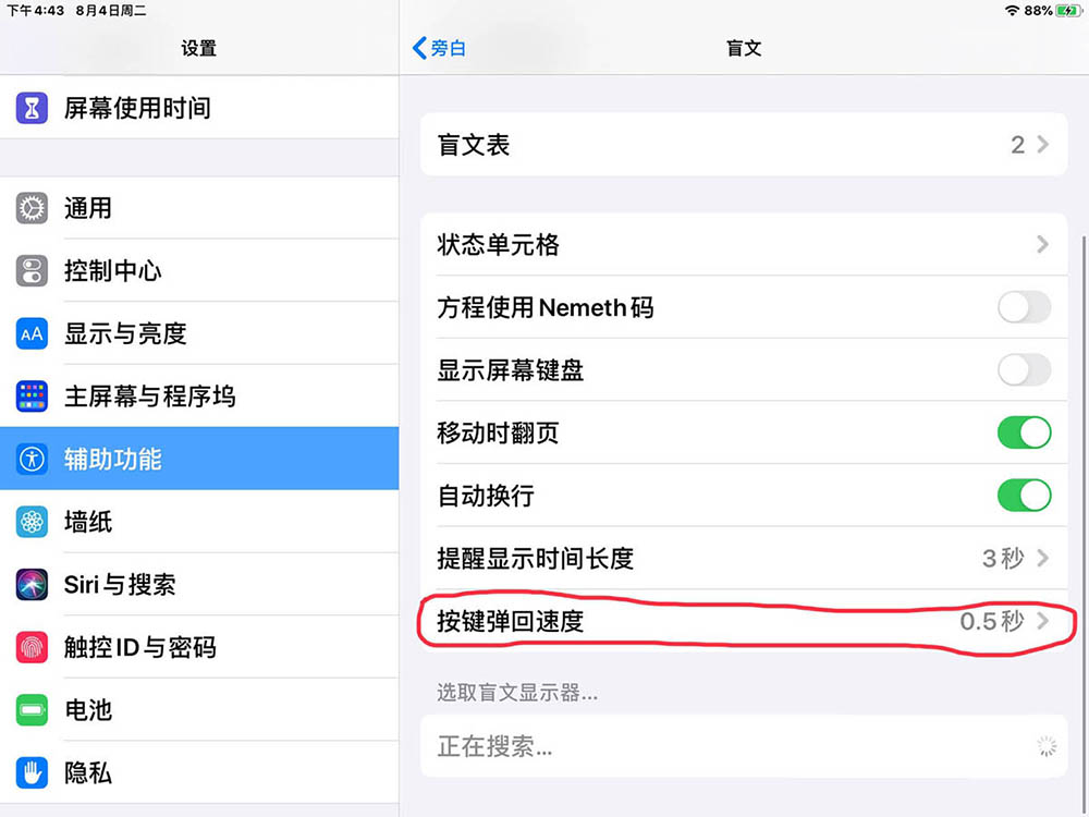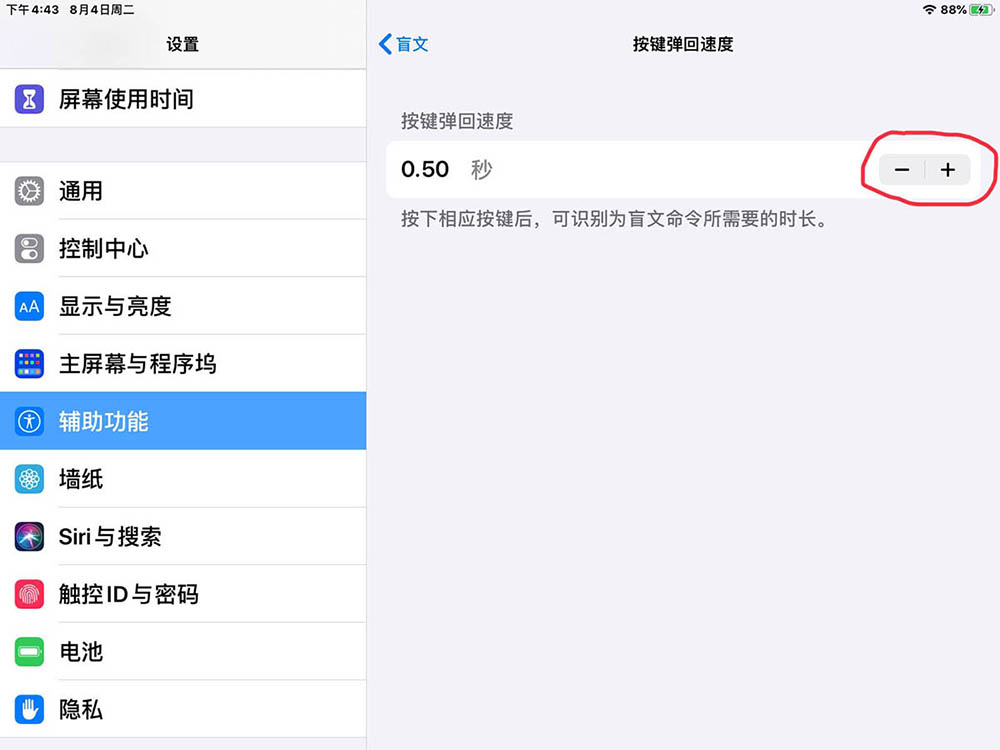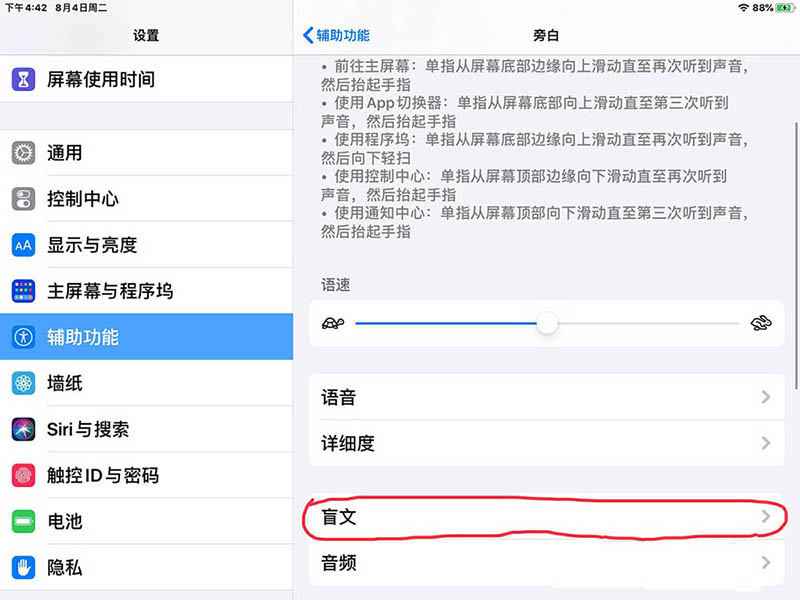 以上就是ipad在旁白设置盲文的按键弹回速度的技巧,希望大家喜欢,请继续关注代码网。