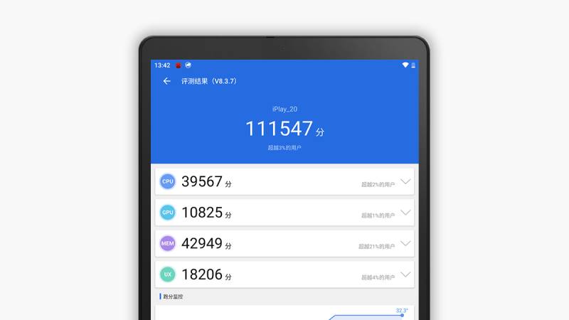 安兔兔跑分成绩为111547分,虽然与旗舰手机动辄50多万的跑分相距甚远,不过对于这款以娱乐、通话和轻度办公、网页浏览为主要用途的设备来说也完全够用了,日常开启微信、qq、浏览器以及在线视频等等表现都比较流畅。