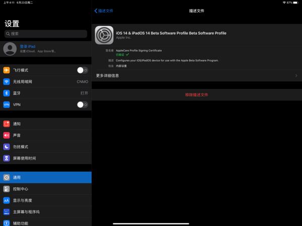 最后,请在网络环境良好的环境下进行升级,本次小编选择使用ipados 14 测试版系统描述文件进行升级。苹果的描述文件其实是系统中的设置文件,借助描述文件用户可以将已经设置和授权过的信息载入到苹果设备中。设置和授权信息包含:设备安全性策略和访问限制、专用网络配置、wi-fi设置、邮件和日历帐户等,因此通过描述文件更新是目前iphone和ipad比较方便的更新方式。