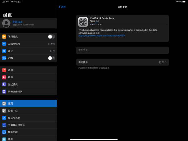 描述文件下载完成后,打开“设置”并选择“描述文件”选项,点击进入刚下载的更新描述文件,点击右上角的“安装”, 点击后页面会出现相关的信息,点击右上方的安装。安装完描述文件后,打开设置通用中的软件更新,在软件更新中就可以检测到ipados 14 public beta版,选择下载并安装,看着进度条缓缓前行,安静等待即可。