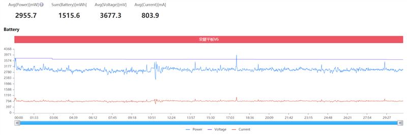 播放视频30分钟,掉电约6%,平均功耗2955.7mw,预计荣耀平板v6的视频续航在9小时左右。
