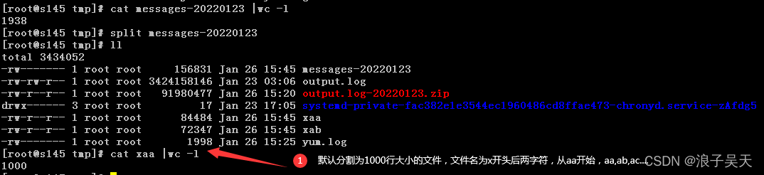 该指令将大文件分割成较小的文件,在默认情况下将按照每1000行切割成一个小文件。