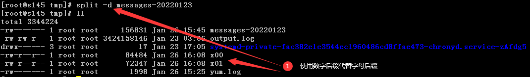 使用split -d filename方式分割后的文件名为x00,x01的数字形式。