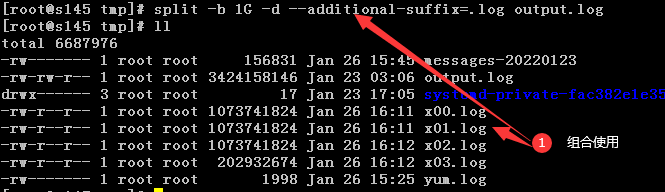 使用命令split -b 1g -d --additional-suffix=.log filename分割文件为1g大小的x00数字形式,文件名后缀为.log的小文件。
