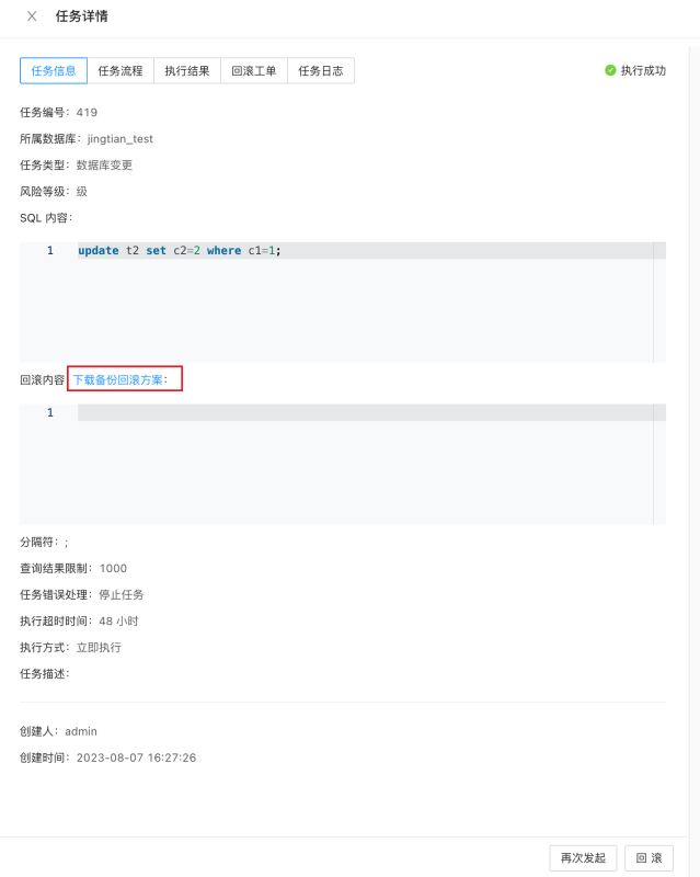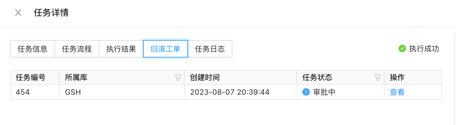 - 如需回滚该工单您可以在此工单的「任务详情」页面的右下脚点击「回滚」重新发起数据库变更工单以申请回滚操作。发起回滚工单后您可以在此工单的「任务详情」中的「回滚工单」页面查看此工单关联的回滚工单。