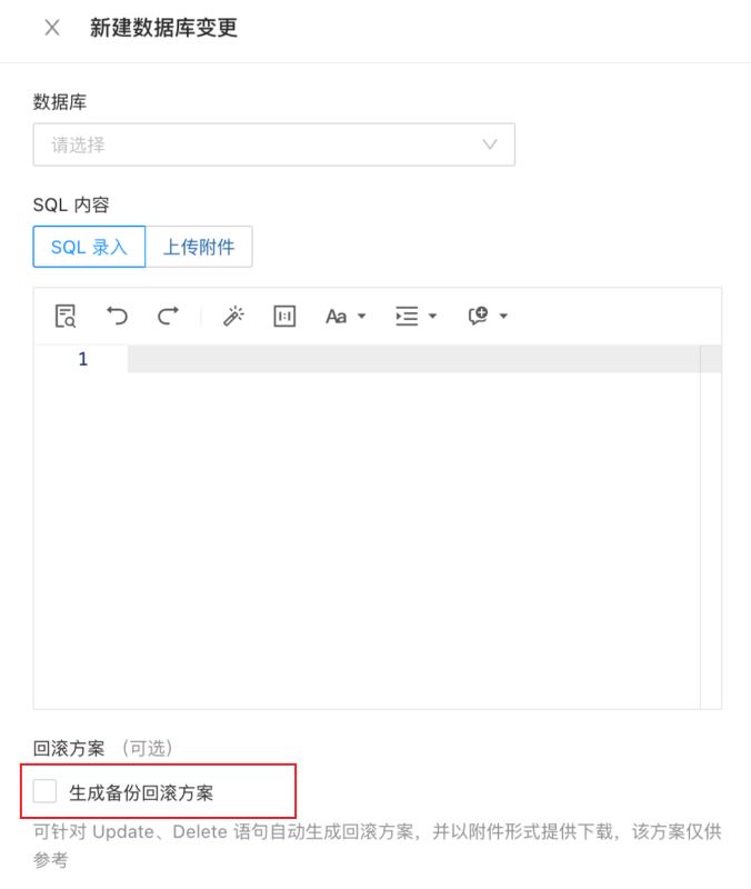 点击「工单」-> 「新建工单」-> 「数据库变更」,在 odc 的「新建数据库变更」页面中,勾选「生成备份回滚方案」并填写工单详情。