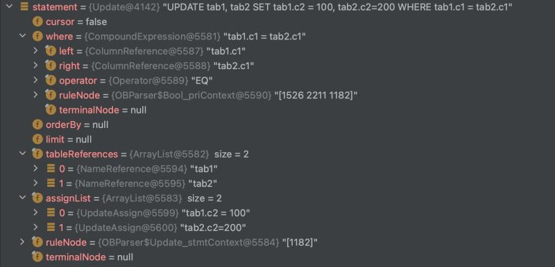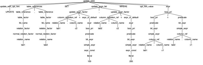 如何基于一条 sql 生成对应的查询原始数据的 sql 呢?其实核心逻辑就是基于解析出的 sql 对象和 sql 语句格式去获取我们需要的信息进而拼接出查询 sql。拿 update 语句为例,以下是 ob mysql 的 update 语句的格式: