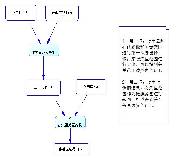 原始数据是最开始的两种输入数据,一是岳麓区的空间矢量数据,二是遥感影像数据。过程数据是第一步操作之后的结果,生成矢量范围边界内的tif数据。结果数据是第二个步骤的结果,是完全符合矢量范围内的tif文件。