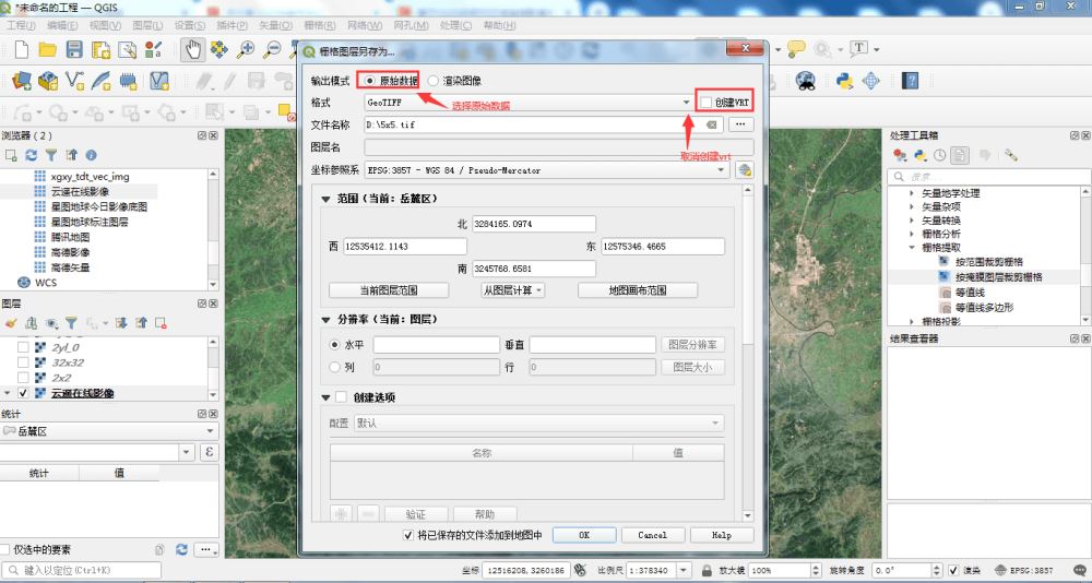 在这里,要设置输出格式原始数据,同时创建vrt的选项建议勾选掉。同时设置当前的tif文件生成后保存的目录。