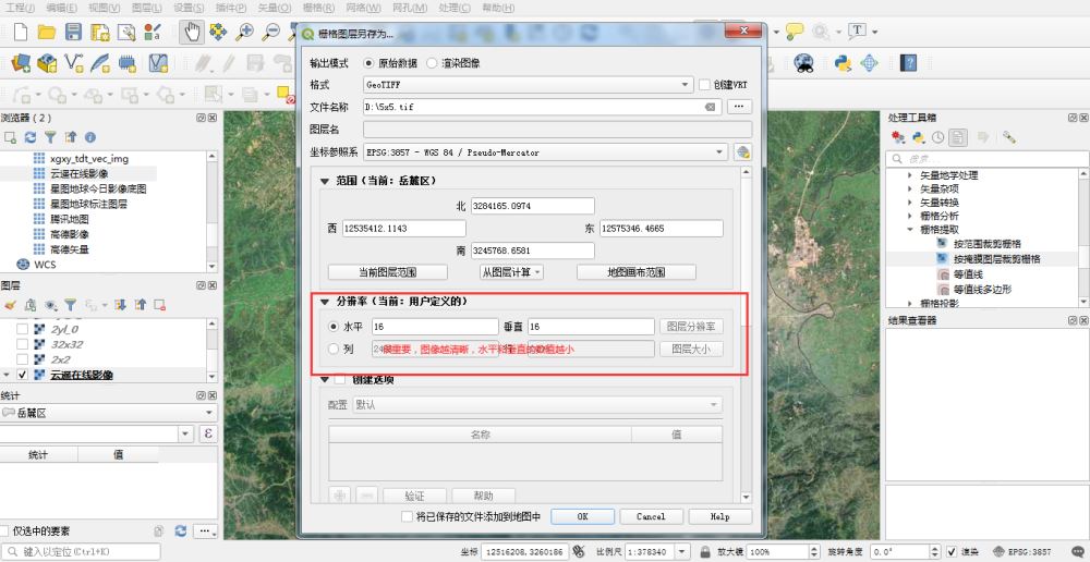 分辨率的设置根据图源做具体的设置,如想要高清的图片,可以把水平和垂直的数字设置的小一点,这样生成的tif就会小很多。