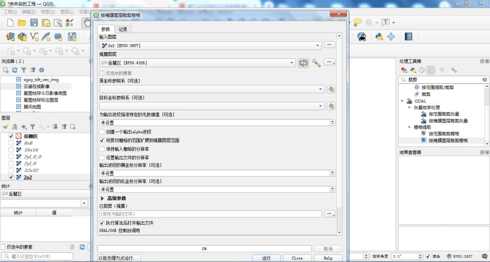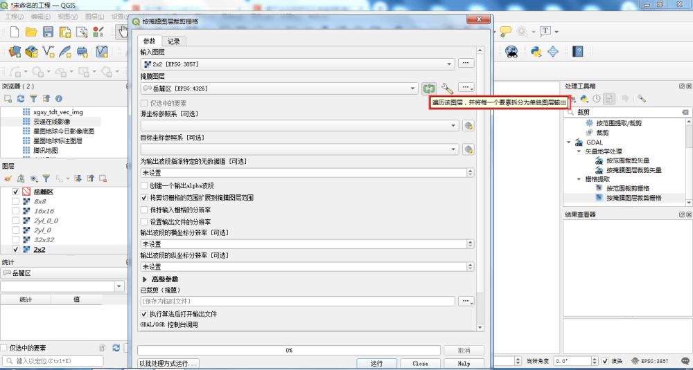 这里的输入图层选择上一步导出的结果,掩膜图层依然选择岳麓区的矢量数据。特别注意:掩膜图层后面的绿色图标一定要勾上,否则无效。按钮勾上的作用是遍历图层,然后拆分单独输出。