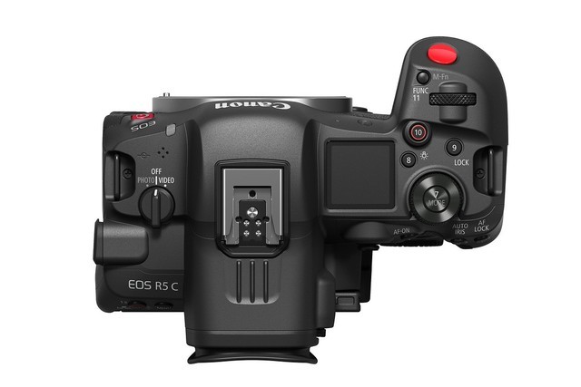 在机身外形上,eos r5c相比r5更加厚重,这是因为在机身中增加了主动散热风扇,以应对视频拍摄时产生的热量,从而可以提供不间断的视频拍摄。机身上的红色快门按钮非常醒目,也标志着这是一台以视频录制为主的专业产品。机身顶部左侧电源开关,分为照片拍摄和视频录制两档,选择photo或video后进入到不同的工作模式,机器会提供截然不用的操作和控制。