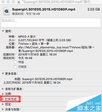 2、在文件简介界面中找到"▶打开方式",展开后即可看到mp4的默认播放器为"quicktime player"。