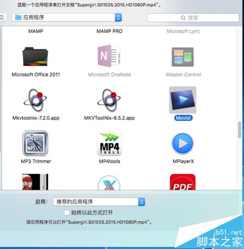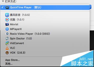 3、点击这个列表框,可以看到你的mac上已安装可以用来打开mp4的播放软件,你可以在列表中选择你需要设置为的默认播放器。