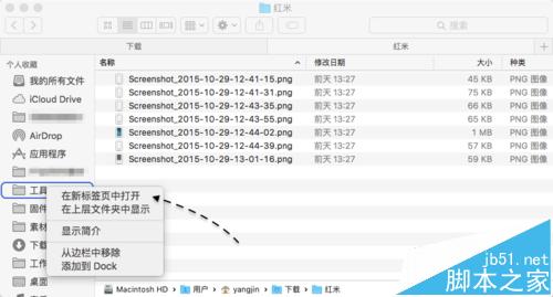 4、相信很多 mac 用户都会把自己常用的一些目录放到 finder 左边的侧边栏中,这样可以很快速地打开这个目录,从而找到想要的内容。同样地,对于侧边栏中的目录,也是可以通过点击右键在新的 finder 标签页中打开的。