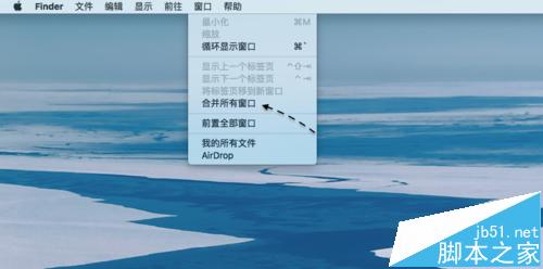 8、此时请点击屏幕顶部 finder 菜单栏中【窗口】菜单,然后点击【合并所有窗口】一栏选项。