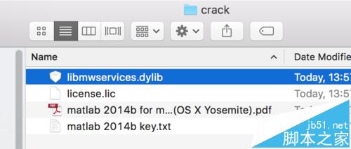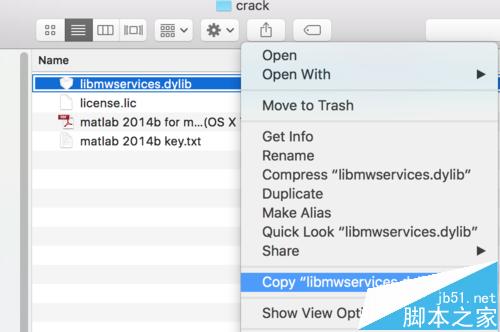 5、找到matlab包内的libmwservices.dylib文件后,右键,移到废纸篓(删除);删除原文件后,再将crack文件夹内的同名文件复制到此处(原文件所在路径)就完成了文件替换。首先是拷贝crack中文件: