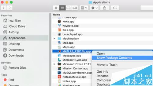 3、选中matlab应用,右键单击弹出菜单中,选择显示包内容show package content,如下所示: