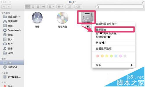 4、选择这个硬盘,然后两只手指同时点击触摸板,在弹出的小方框中选择“显示简介”即可。