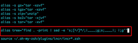 alias tree="find . -print | sed -e 's;[^/]*/;|____;g;s;____|; |;g'"
