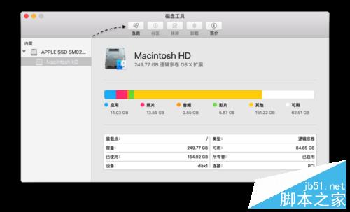 3、在磁盘工具中,在左侧窗口中选择好想要修复的磁盘,然后再点击顶部的【急救】按钮,如图所示