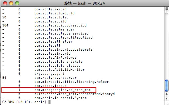 然后,可通过共享等方式将脚本文件ae_scan_mac.sh和plist文件ae_scan_mac.plist拷贝到本地硬盘的一个临时目录中,然后打开实用工具→终端,使用以下命令: