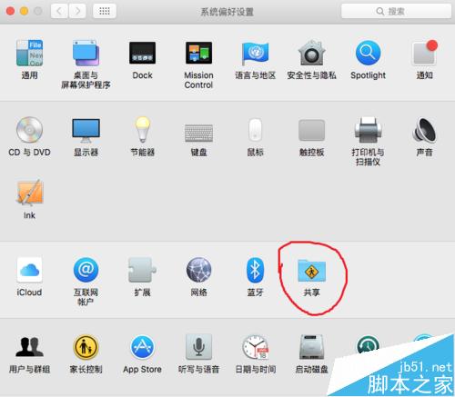 3、接下来是关于如何在windows上访问mac上共享的文件夹。首先在mac上打开系统偏好设置,在设置中点击共享。