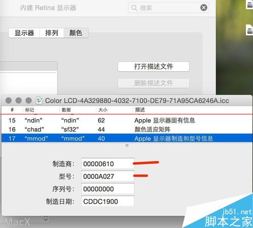 1、首先打开系统偏好设置 - 点击显示器 - 颜色 - color lcd - 打开描述文件 里面找到第17行,一般就是最后一行. 你会看到如图有 610 a027的字样. 好先记下即可.